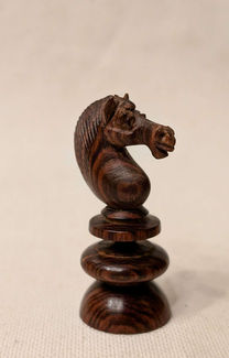 The knights are beautifully carved, and all the pieces are well turned and polished out of boxwood and rosewood. There is what looks like evidence of where a round maker's label had been applied under one of the dark rooks. The rosewood black side has the finest and most beautiful wood grain I have yet seen in a set. Kings are 3.5" tall (their large crosses forming a good part of their height!).