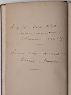 Wonderfully, this book was awarded as a prize to William Hoole (?) for coming second in the 1896-97 season St Ignatius Chess Club Tournament. I can only imagine the slight implied by being awarded a book on chess for coming second!