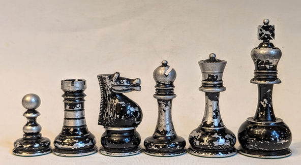A rare example of a turned aluminium chess set, attributed to Bertram Jones (who mostly turned ivory sets). I have seen one other set before, which is in Guy Lyons' fantastic collection. Kings are 3 5/8" tall, and weigh in at 81g - and whilst the paint has seen better days, the wear and flaking reveals the turned nature of the metal, as well as highlighting the details, especially on the knights (which I assume were cast and polished to remove any mould seams).