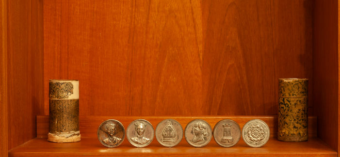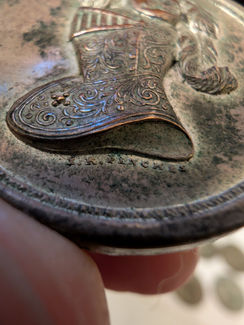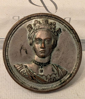 The pieces are not solid metal - they are a thick electrotype shell, which I believe was then filled an enamelled leather (this information came courtsey of the wonderful Jon Crumiller, who sent me an article detailing this in "Family Friend" from 1850. I had initially thought that the enamelled leather was wax) before a black felt was added to finish the disc. The light side is silvered, whilst the dark side is bronzed.