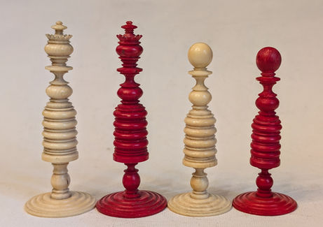 A lovely set with king finials that I have not seen before. Whilst barleycorn and ribbed sets were made throughout the 19th century, to my eye this appears to be an early one from the form of the rooks, knights and the various small inconsistencies in turning. Kings stand just over 3.2" tall.