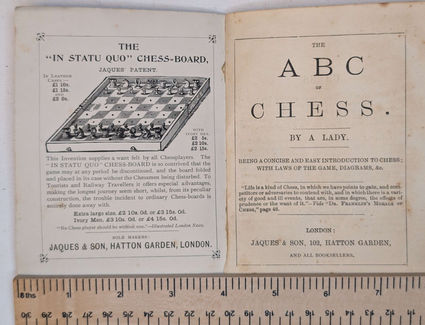 A relatively common booklet, sold by Jaques - and I suspect cross-sold by Jaques to purchasers of chess sets. This nice, clean example was found inside the box of my 1895 Jaques Tournament set. With an introduction to chess "by a Lady", along with a host of Jaques adverts and prices for chess sets, boards, compendiums, and other games.