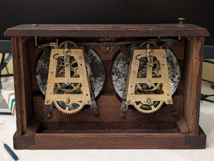 Another very generous collector and member of various chess Facebook groups gifted me this lovely old clock. It was in need of some care when I received it - the wooden case had shrunk leading to several cracks across the face, the clock faces were stained with oil (one has restained itself, and the mechanism needs a good clean!) the clocks weren't working, and nor was the mechanism.